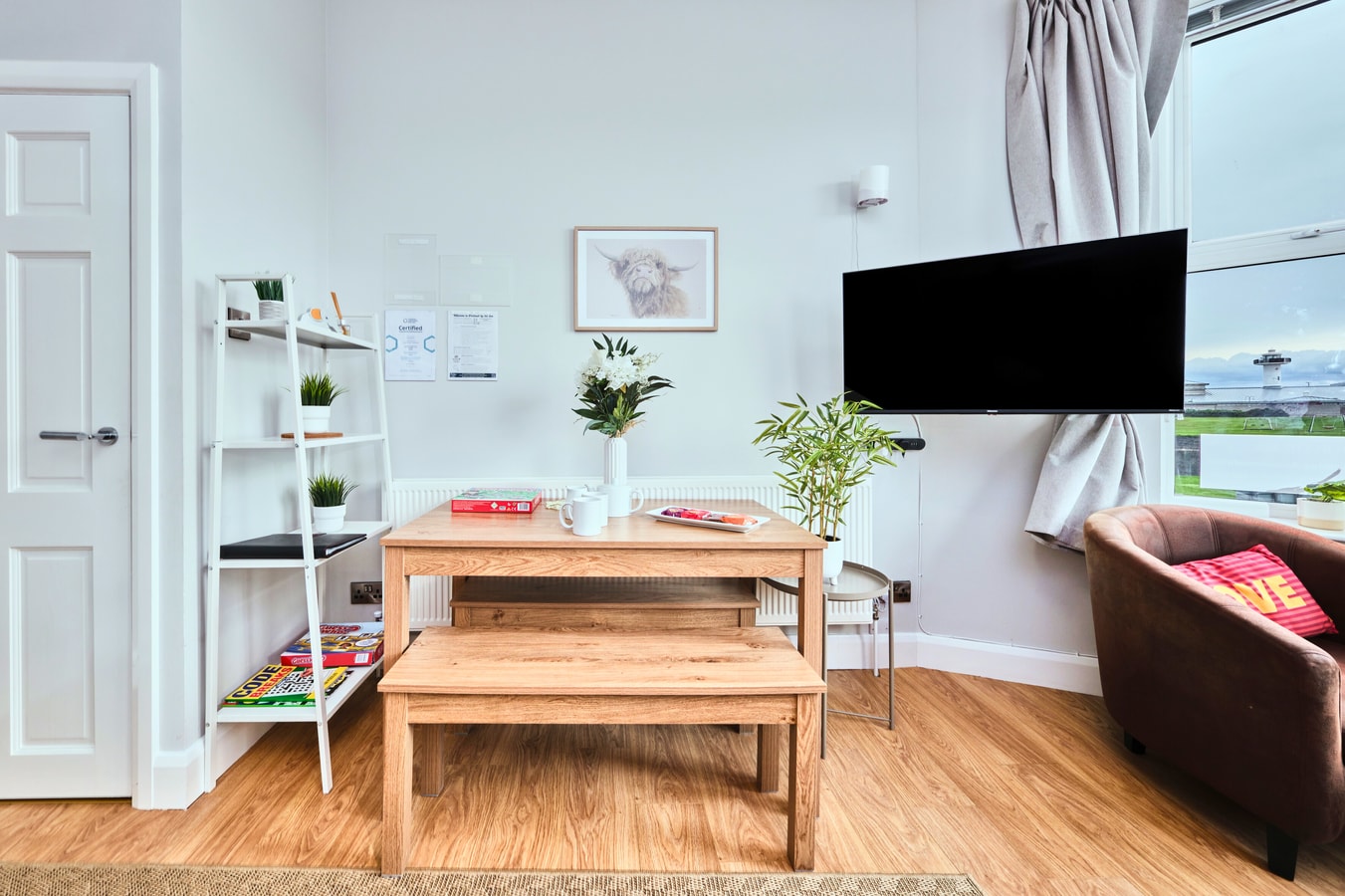 Step into a bright, airy, open-plan living space where a large bay window frames beautiful views over Dunluce Park. After a day of exploring, unwind on the comfortable corner sofa or gather for a meal at the wooden dining table that seats six.