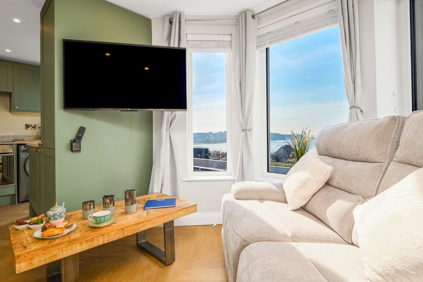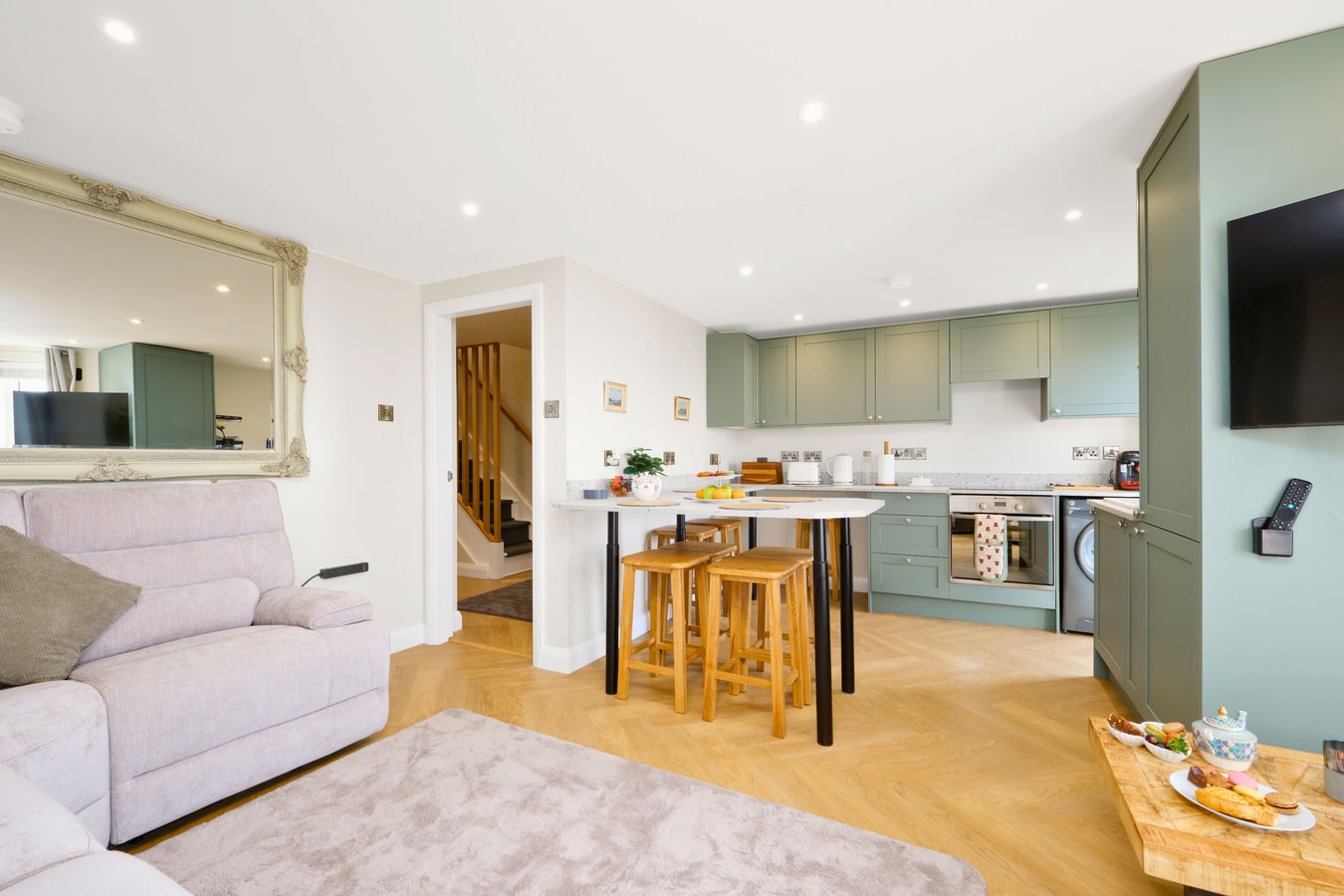 The spacious open-plan living, dining, and kitchen area is designed for relaxed family gatherings or group breaks. Sink into comfortable sofas, enjoy movie nights on the smart TV, or listen to music on the sound system. The breakfast bar table seats everyone comfortably, while large windows flood the space with light and frame those enviable sea views — ideal for checking the surf or watching the waves roll in before heading down to the beach in just minutes.