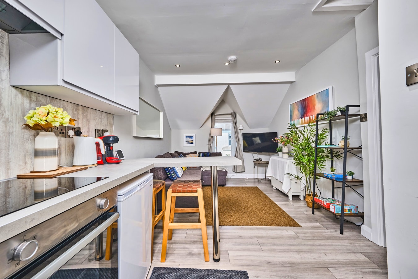 The sleek, fully equipped kitchen features white gloss cabinets and a breakfast bar, creating a modern space for cooking and dining. You'll find everything you need, including: